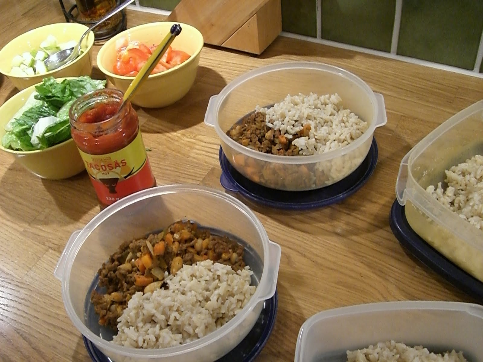 Vi lagade tacoköttfärs till lunch, som vi åt med fullkorns tortillabröd och grönsaker. Ett tips som jag kan ge er är att det är smart att alltid laga mer mat än man vet att man kommer äta när man väl lagar. Vi lagade en ganska stor sats med tacoköttfärs så att det räckte till fyra matlådor förutom det vi åt till lunchen. Medan vi lagade maten satte vi på en kastrull med ris, som vi hade i våra matlådor. Perfekt!