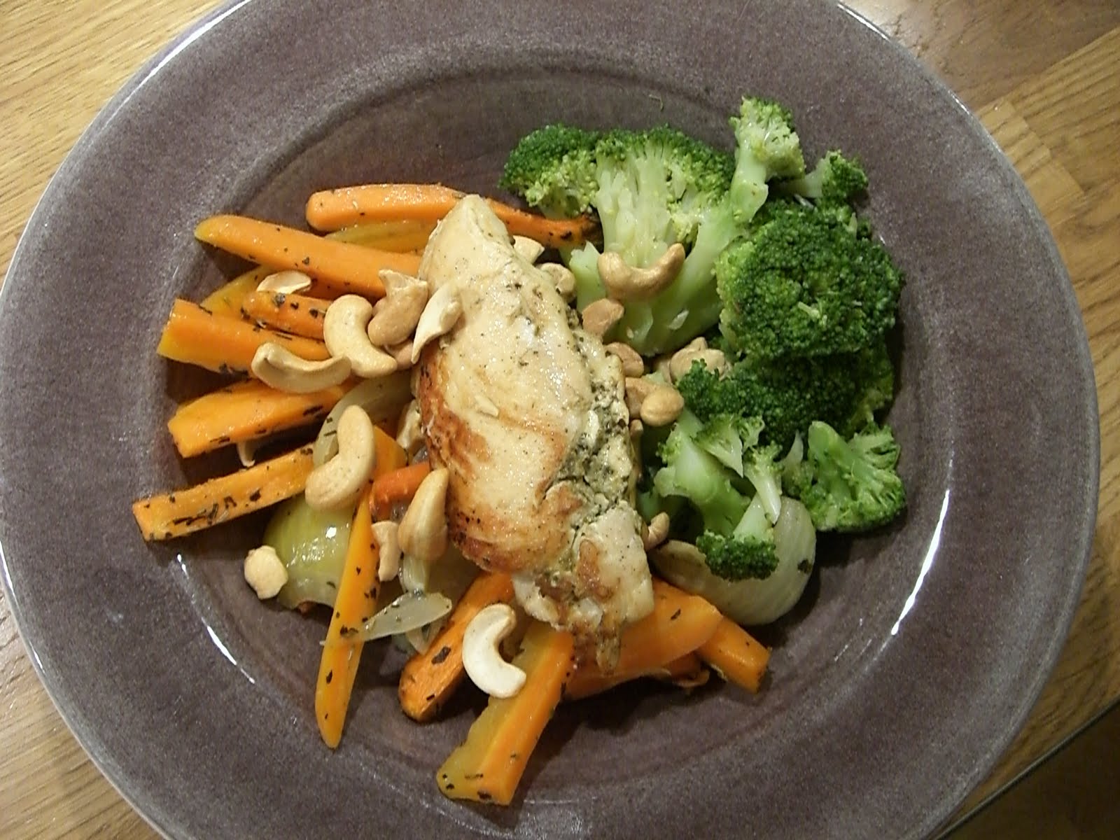 Ikväll blev det pestokyckling och grönsaker till middag. Jag lagade pestokyckling och ungsrostade potatis och rotfrukter till matlådor nu ikväll. Av detta tog jag en kycklingfilé till middagen och åt tillsammans med morötter, kokt broccoli och cashewnötter.