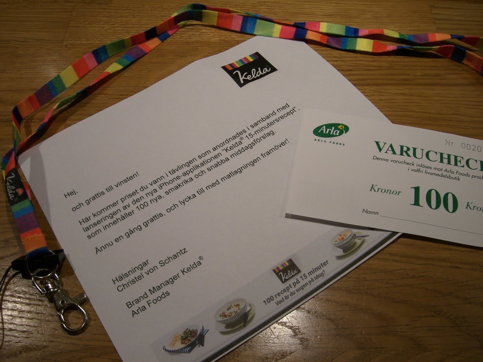 Jag var den lyckliga vinnaren i tävlingen och idag fick jag hem vinsten: en presentcheck för Arla Foods produkter. Det får bli till att handla hem några Kelda-soppor helt enkelt. Tack Molly för vinsten!