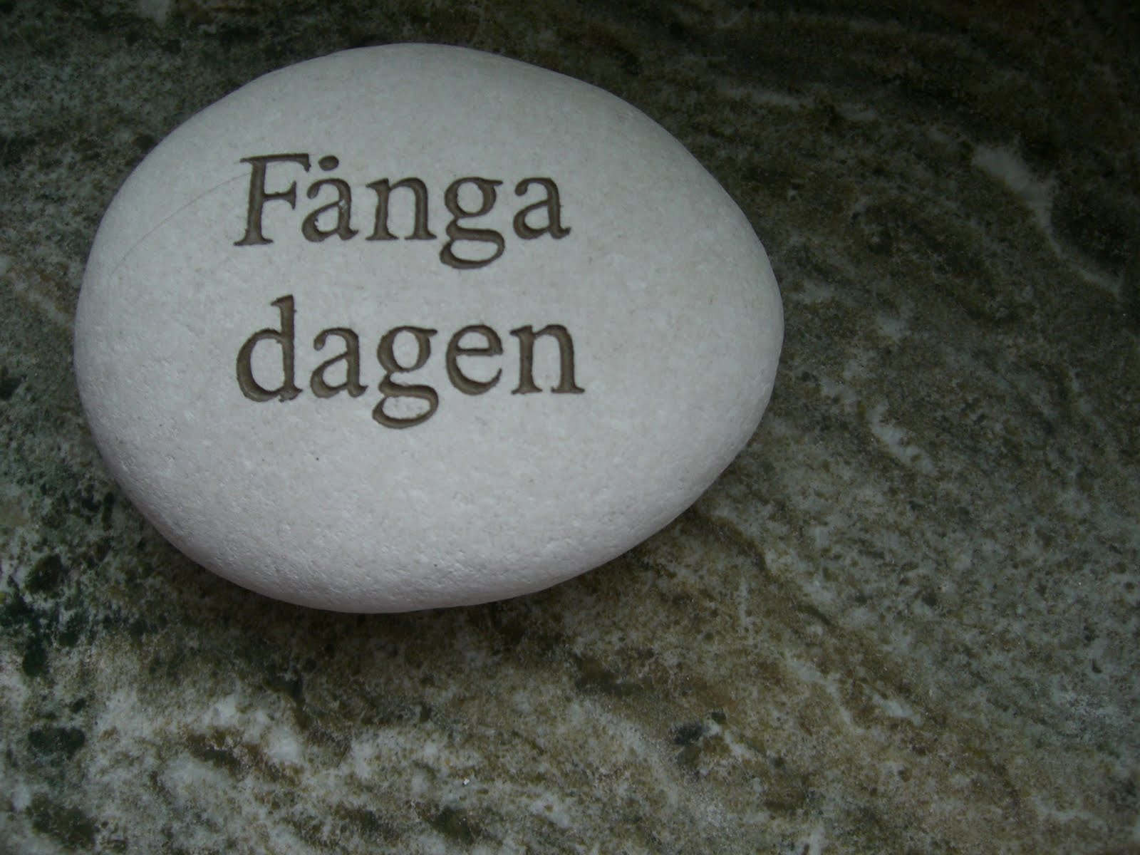 Denna sten ligger i badrumsfönstret hemma hos Linda och Daniel, där jag var i helgen. Jag tycker att det är viktigt att påminna sig själv om detta budskap varje dag. Det kan låta enkelt, men ibland kan det vara riktigt svårt att leva i nuet. Att mötas av denna text varje dag är ett smart sätt att påminna sig själv om att Fånga Dagen.