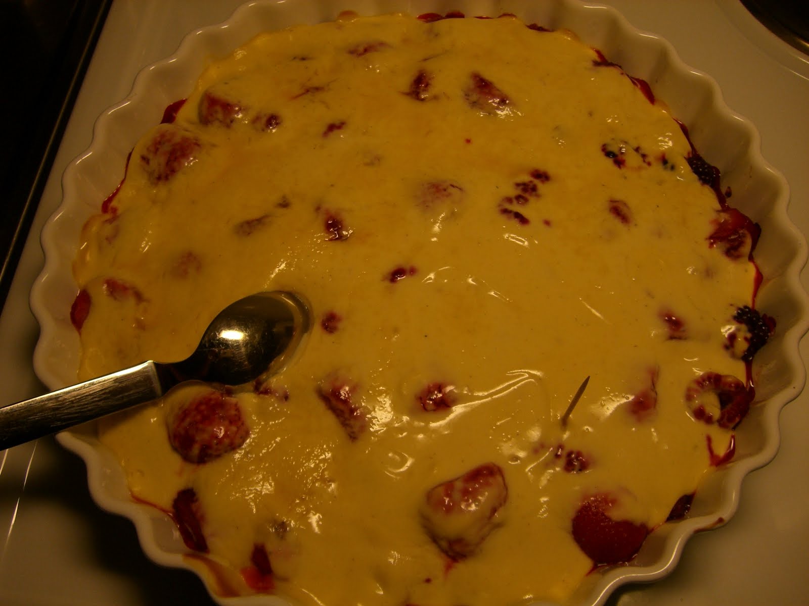 Häll upp bären i en pajform. Blanda kesellasorterna med varandra och häll dem över bären. Ställ in i ugnen på 200 grader i 20 minuter. Klart!