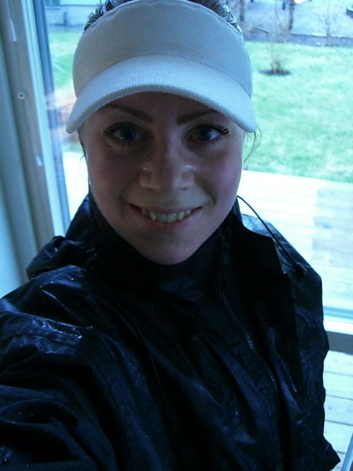 Jag var hemma en sväng för att ladda energi i form av en banan och en halv proteindrink. Sedan begav jag mig ut igen. Denna gång med skärmkeps och regnjacka. Det var tur, för den tidiga morgonens duggregn gick nu över till hällregn. Så det blev en blöt löparrunda.