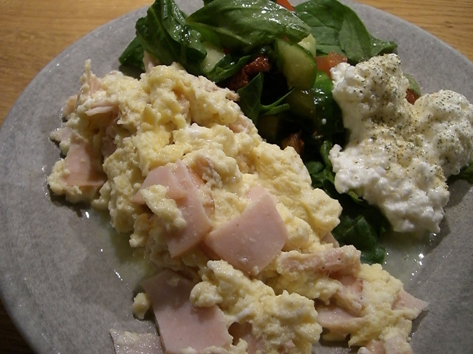 Jag brukar ofta avsluta min dag med att äta ägg till middag. Så blev det även ikväll då jag åt äggröra gjord på två ägg och kalkon. Till det minikeso och sallad. Ägg är rika på proteiner, vilket är bra att äta mycket av på kvällen.