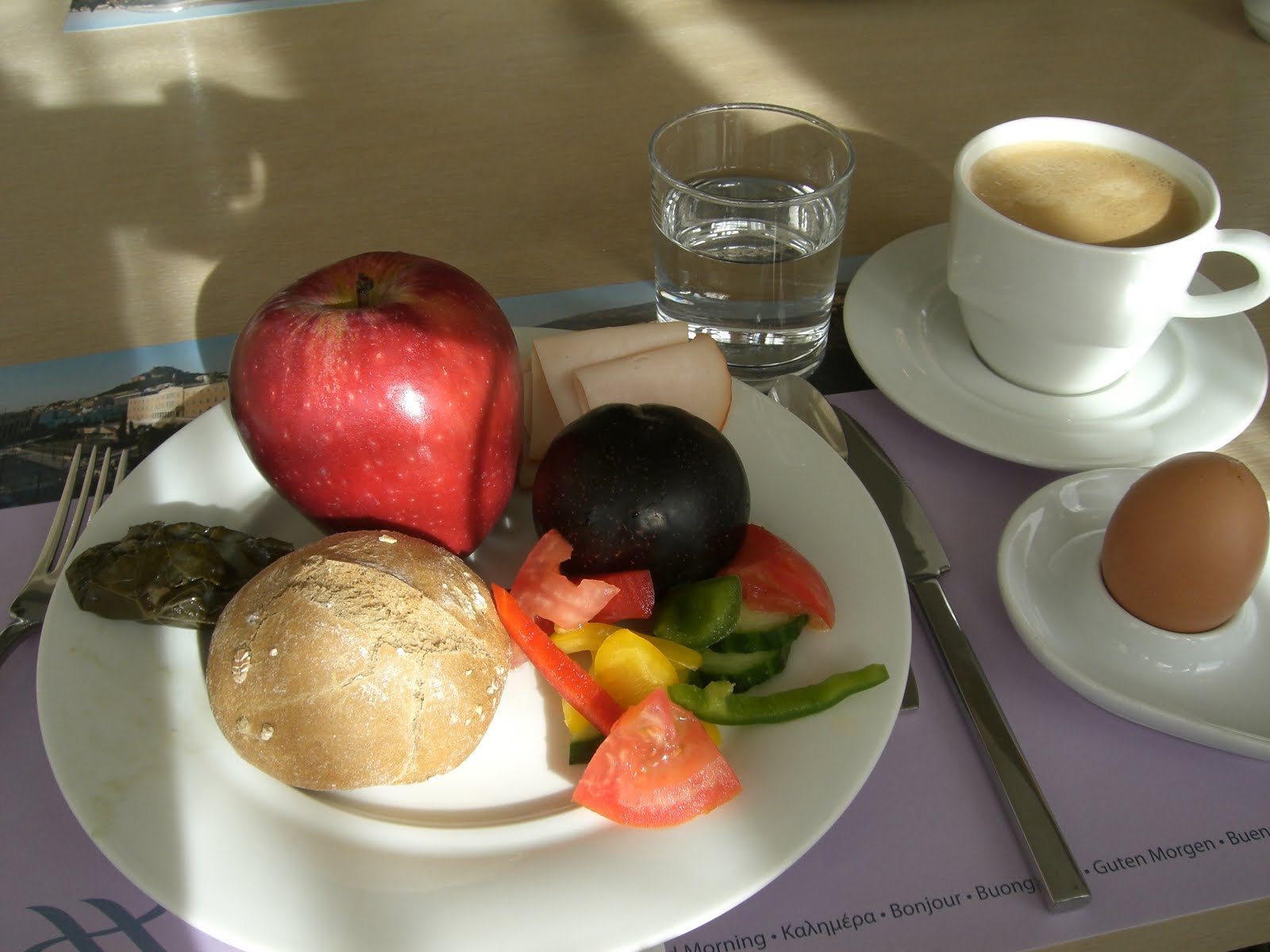 Jag njöt av gott kaffe, frukt, grovt bröd, kokt ägg, kalkon och grönsaker.