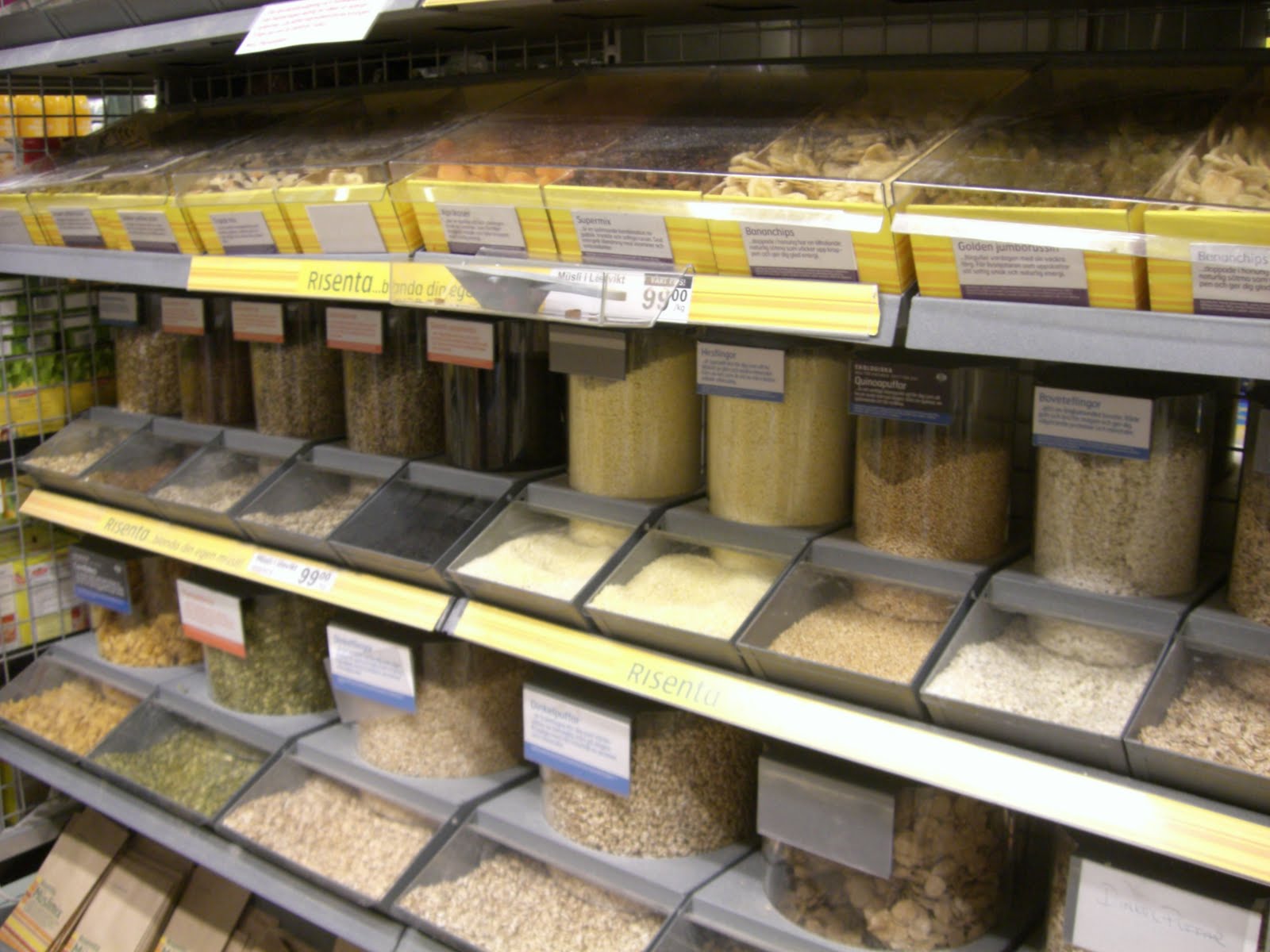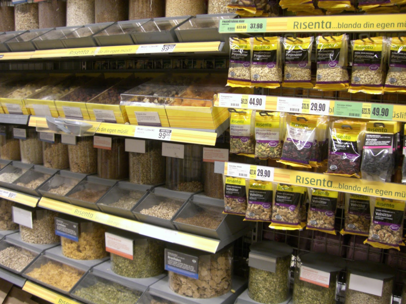 Det bästa är om man kan blanda sin egen müsli, tycker jag, istället för att köpa en färdig müslisort i butiken. Idag när jag var och handlade på DagLivs kunde jag inte låta bli att ta kort på denna härliga hylla. Risenta säljer lösvikt av olika gryn, frön, flingor, nötter och torkad frukt, som man kan blanda efter eget tycke och smak.