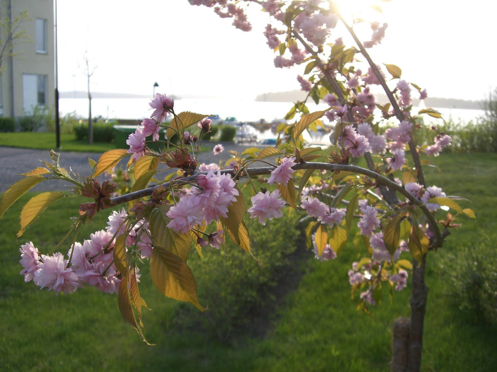 På vår lilla trädgårdsplätt blommar nu vårt körsbärsträd med vackra, rosa blommor.