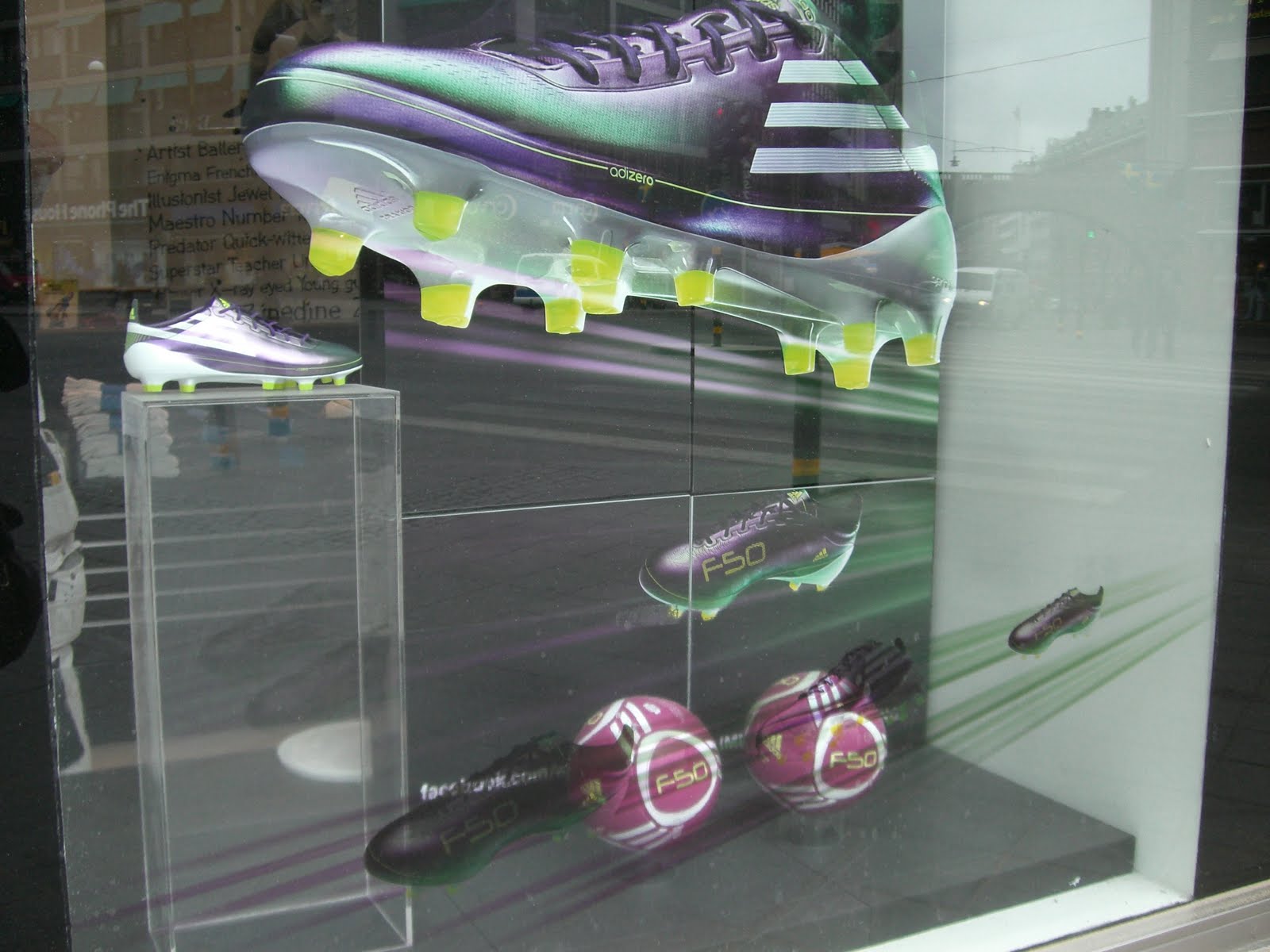 I ett av Adidas andra skyltfönster hade de fotbollsskor och fotbollar. För imorgon börjar Fotbolls-VM. Även fast Sverige inte är med denna gång så tycker jag att det ska bli kul att kolla på matcherna under den kommande månaden. Jag har dock inte bestämt mig ännu för vilket lag jag ska heja på. Kanske Tyskland?