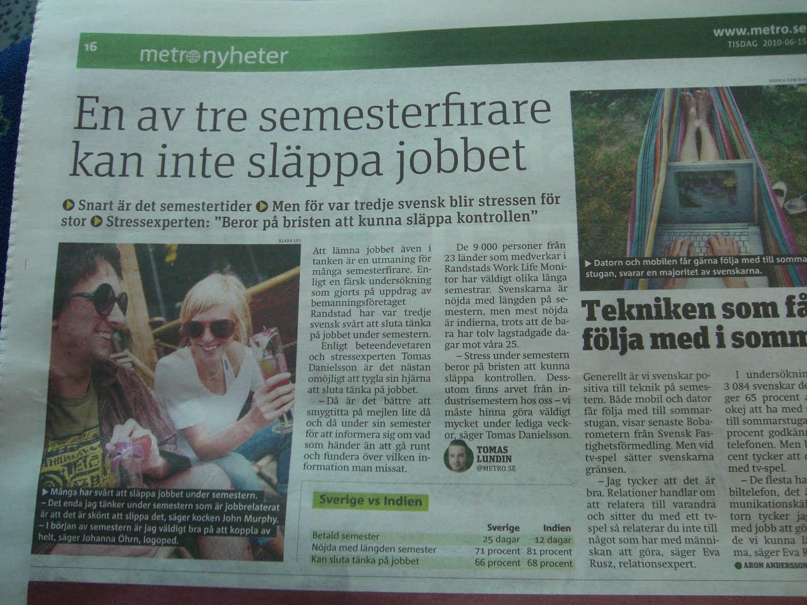 I morse läste jag i tidningen Metro om att många svenskar har svårt att koppla bort jobbet på semestern. Var tredje svensk är stressade under semestern för att de inte kan logga ut från jobbet helt och bara vara lediga. Detta är inte bra, tycker jag.