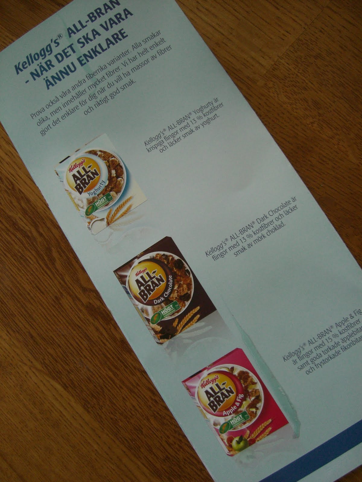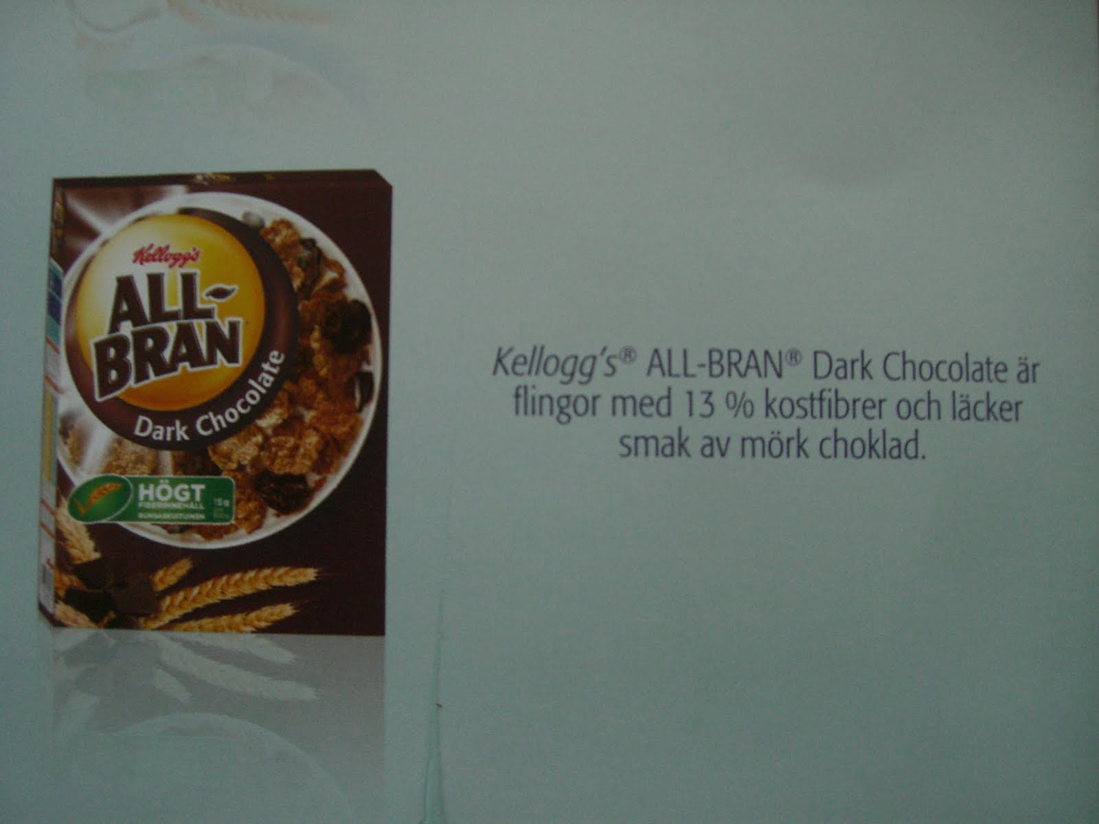 Vad jag inte tycker är okej däremot är att vissa onyttiga livsmedel marknadsförs som om de skulle vara nyttiga. Kellogg’s har till exempel ett gäng olika sorter All Bran flingor. Må vara att originalvarianten av All Bran är hyfsat nyttig och har ett bra fiberinnehåll. Men All Bran Dark Chocolate, som alltså är en flinga med choklad, ser jag inte som en nyttig produkt alls. Denna produkt marknadsförs som en flingsort som har 13% kostfibrer och ingår i Kellogg’s serie med fiberrika och hälsosamma flingor. Choklad till frukost? Nej tack. Och det är definitivt inte ett nyttigt och hälsosamt alternativ.