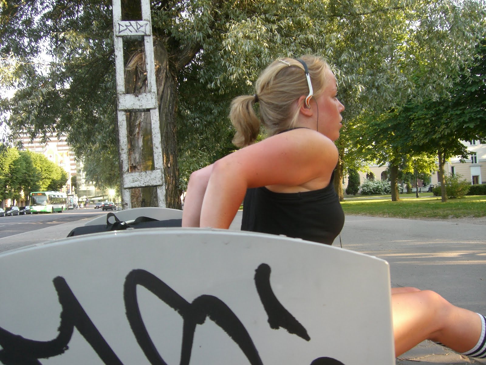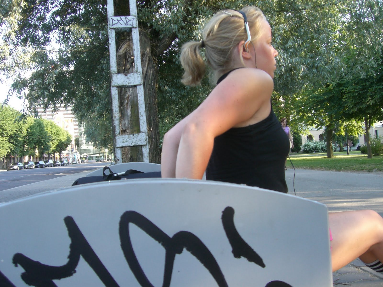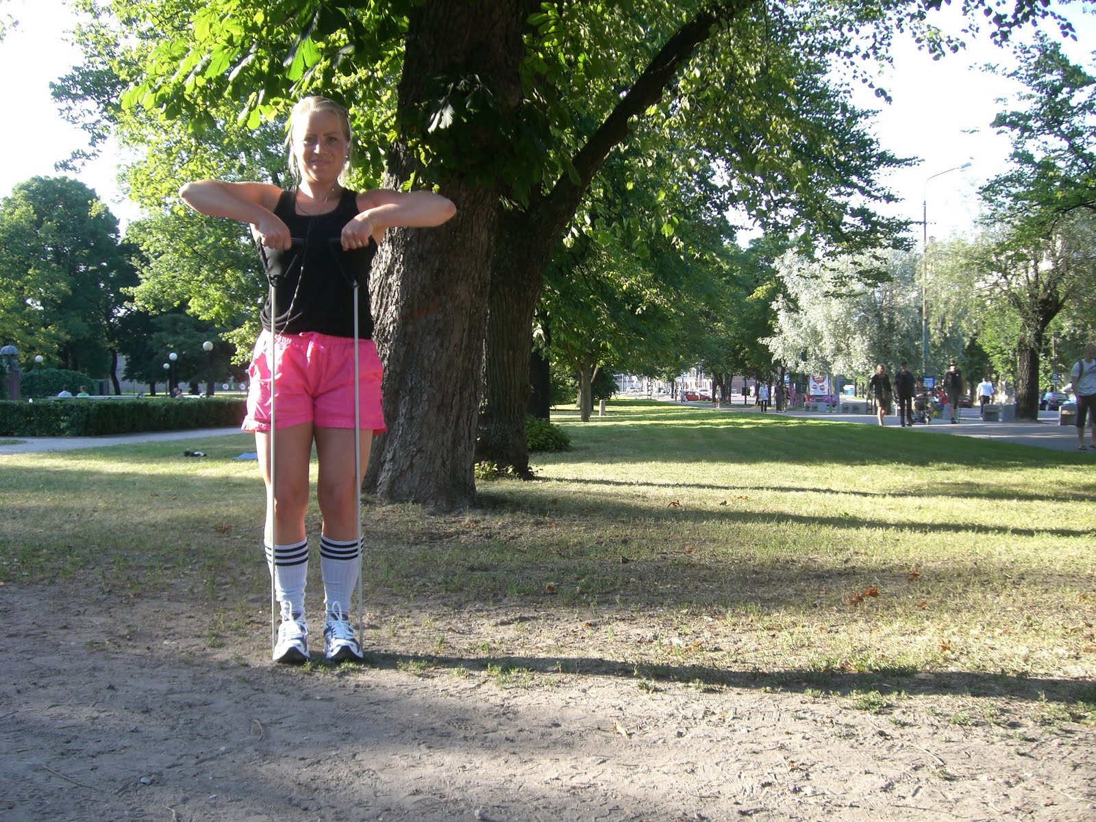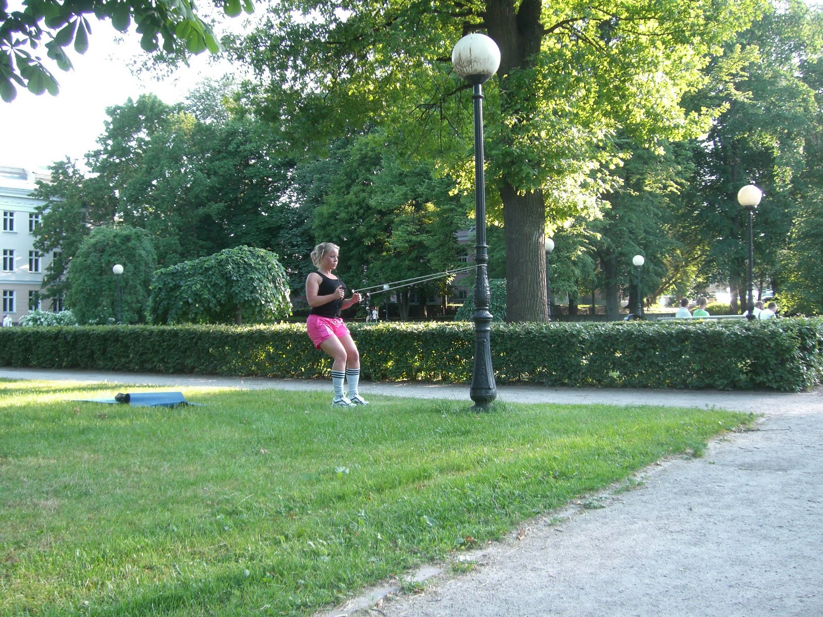 Matta+och+tr%C3%A4ningsrem - Styrketräning i en park i TallinnKarin+tr%C3%A4nar - Styrketräning i en park i TallinnNär jag hade jobbat klart för dagen gick jag till företagslägenheten här i Tallinn, där jag kommer sova i natt. Där lämnade jag av mina väskor, bytte om och begav mig sedan genast ut i den vackra, soliga kvällen.