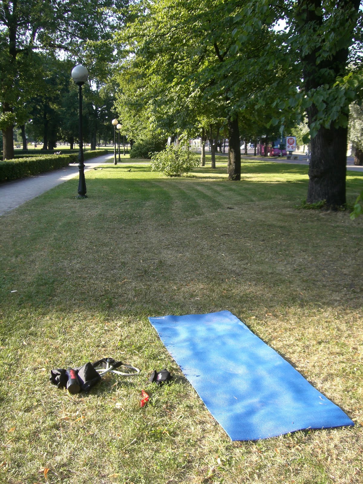 Jag gick en rask promenad till närmaste park, letade upp en solig plätt och bredde ut min träningsmatta där. Sedan tränade jag ett pass styrka med träningsrem och egen kroppsvikt i nästan en timme. En del ester tittade lite konstigt på mig, men det bjöd jag gärna på. För mig var huvudsaken att jag fick till ett bra träningspass och det fick jag.