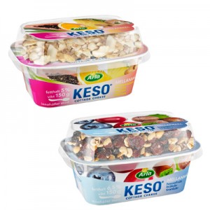 Arla har breddat sitt sortiment av cottage cheese med dessa supersmarta KESO® Mellanmål, ett gott, mättande mellanmål laddat med nyttigheter. Förutom den naturella keson tillkommer i denna mellanmålsburk frukt, nötter och bär. Dessa är smart förpackade i locket med en plastsked. Mellanmålet finns i två olika smakkombinationer; hasselnötter, blåbär och tranbär eller cashewnötter, ananas, papaya och apelsin.