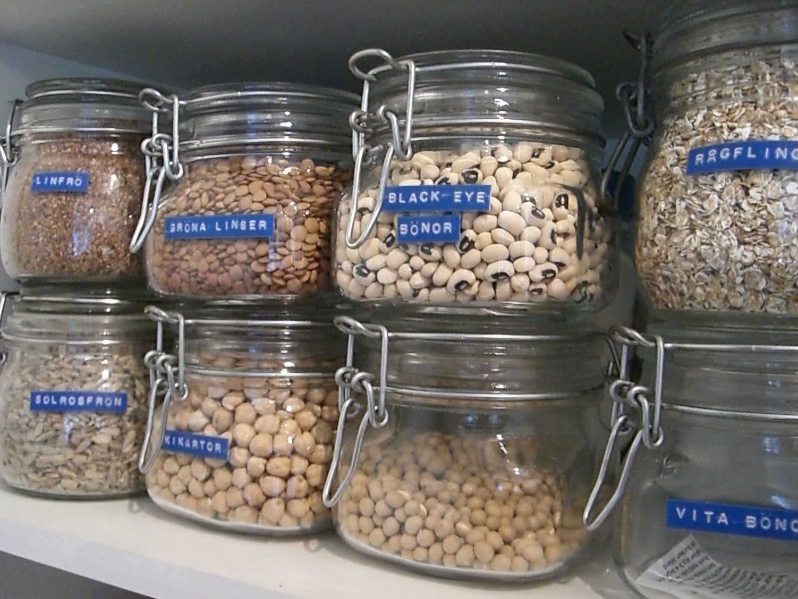 Nu är hyllan i skafferiet påfyllt med glasburkar som innehåller linfrön, solrosfrön, linser, kikärtor, bönor och rågflingor. Det är perfekt att till exempel ta fram en burk linfrö på morgonen och strö över filen eller gröten. Och så ser det lite roligare ut i skåpet!