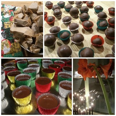 Bild 2: Chokladkola i papper, Mozartkulor, Ischoklad, Amaryllis och ljusstake i vårt fönster