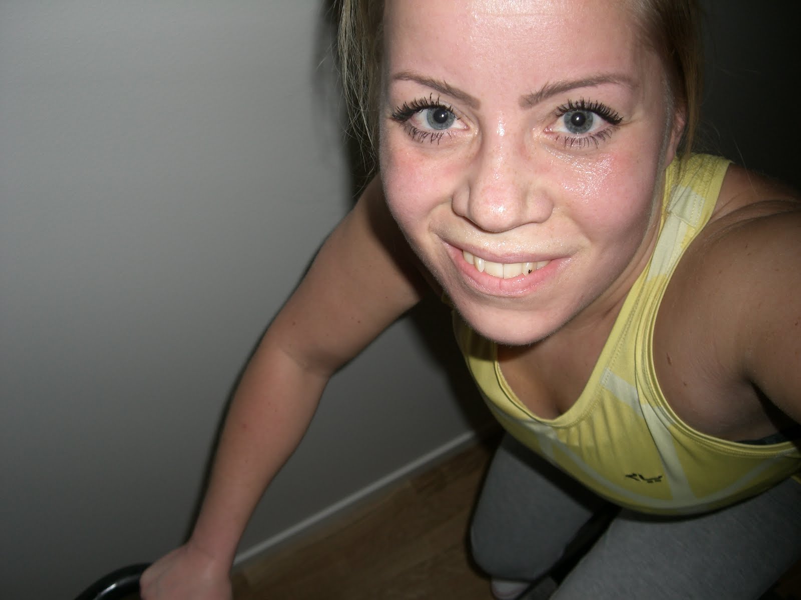 Karin%2Bspinningcykling%2B1 - Spinningcykling i mörker och bootyträning i ljusMin onsdag startade tidigt med träning hemma. Jag spenderade en halvtimme på spinningcykeln och körde sedan igenom Booty Express passet på en halvtimme. Vår spinningcykel står i ett av de rum som vi fortfarande inte har fått i ordning. Vi har bara en liten lampa i fönstret där. Därav anledningen till att jag var tvungen att använda blixt när jag fotade mig själv på cykeln. Det var riktigt mysigt att trampa på i det dämpade ljuset! Bootyn körde jag dock i ett annat rum där vi har mer lampor.