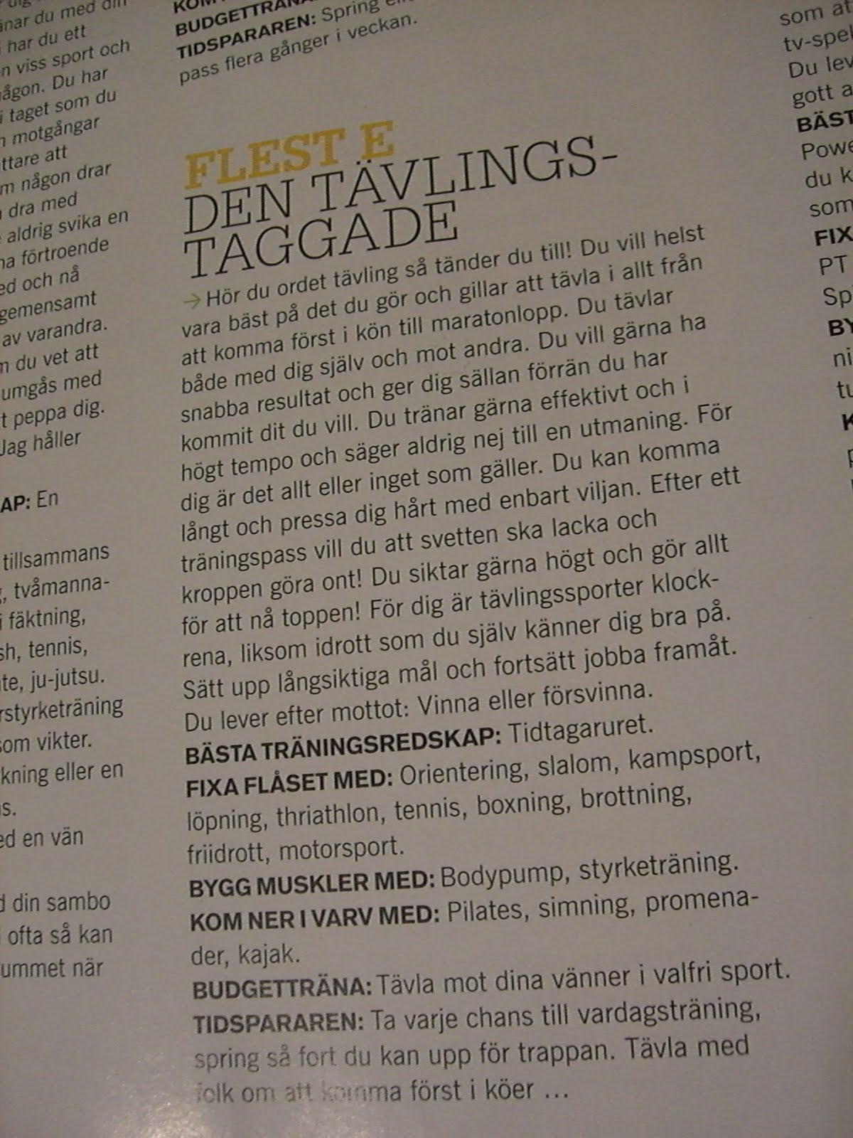 I senaste ToppHälsa numret finns det ett test man kan göra för att ta reda på vilken träningstyp man är och vilka träningsformer man bör satsa på. Jag har just gjort det testet. De flesta av mina svar matchade med träningstypen ”den tävlingstaggade”, men nästan lika många av mina svar matchade med ”den disciplinerade”. Så jag skulle vilja säga att jag är en blandning av dessa två. Jag är inte ett dugg förvånad över testresultatet utan tycker tvärtom att det stämmer väldigt bra överens med mig.
