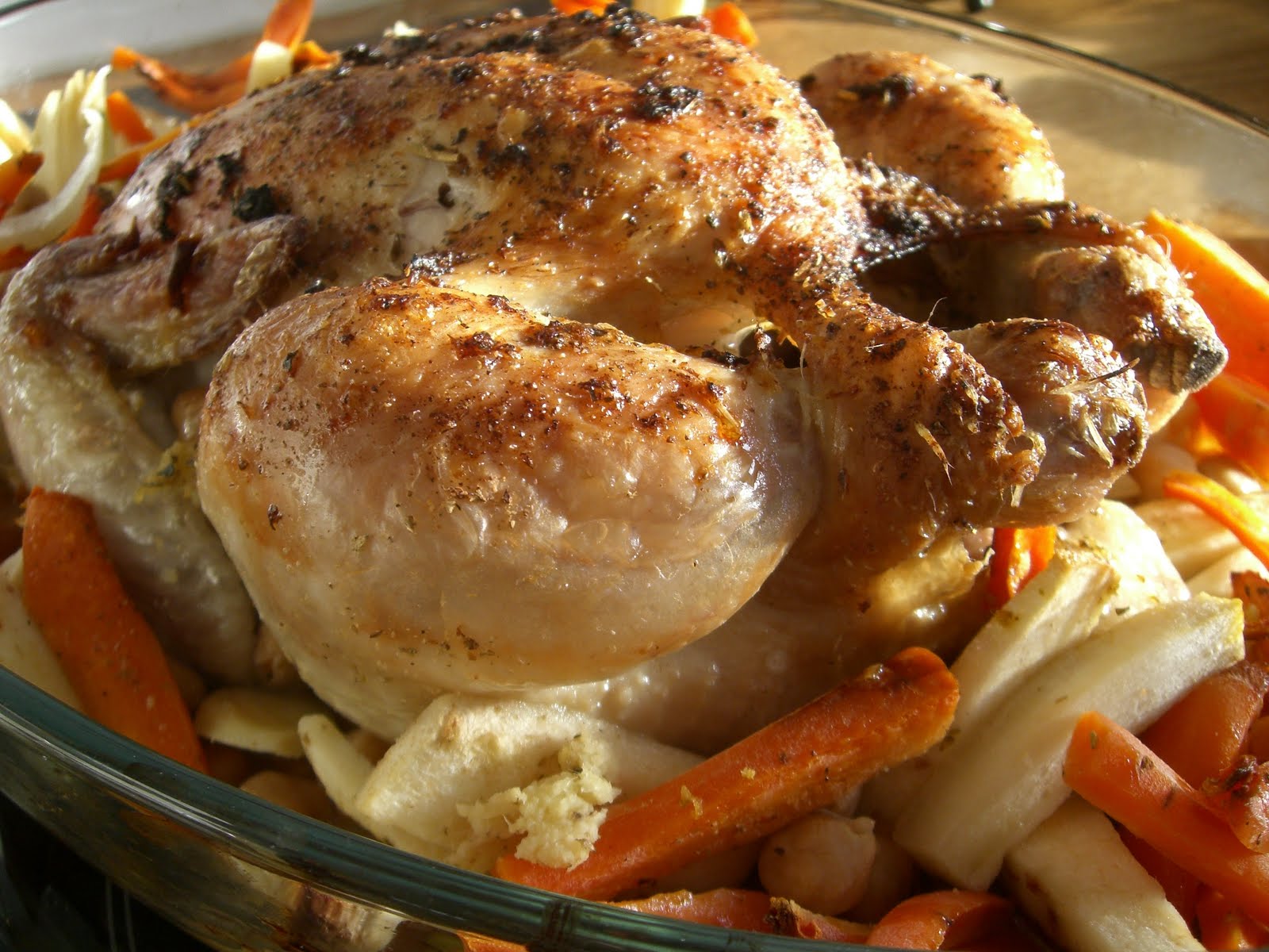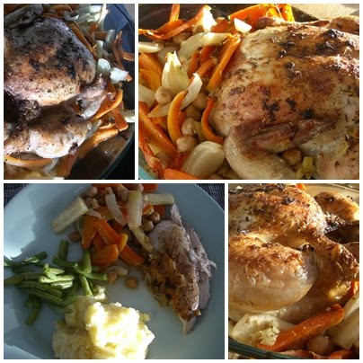 Idag lagade vi en riktigt god lunch med kyckling kryddad med citron, ingefära och vitlök och ugnsstekt tillsammans med rotfrukter, grönsaker och kikärtor. Till det åt vi hemlagat potatismos och haricot verts. Denna maträtt var både mycket god och enkel att göra. Den skötte sig själv i ugnen, så medan vi väntade på att maten skulle bli klar kunde vi göra annat (som att sova/vila). Här kommer receptet.