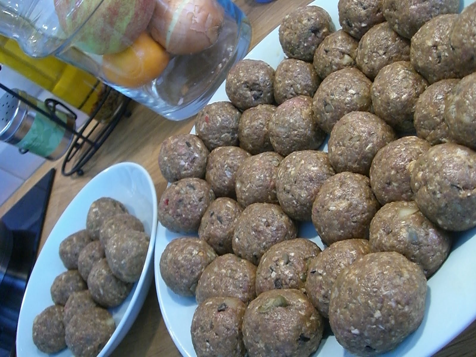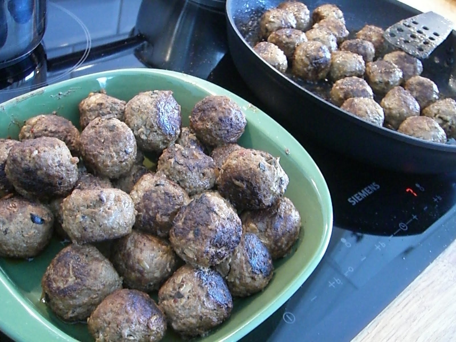 I mina köttbullar har jag alltid gul lök, vitlök, dijonsenap, kapris, svarta oliver, soya, sambal oelek, chili och peppar som smaksättare. Dessutom har jag i ägg, havregryn och vatten för en bra konsistens. Det brukar bli enligt det här receptet, även om det var hamburgare jag gjorde av färsen den gången.