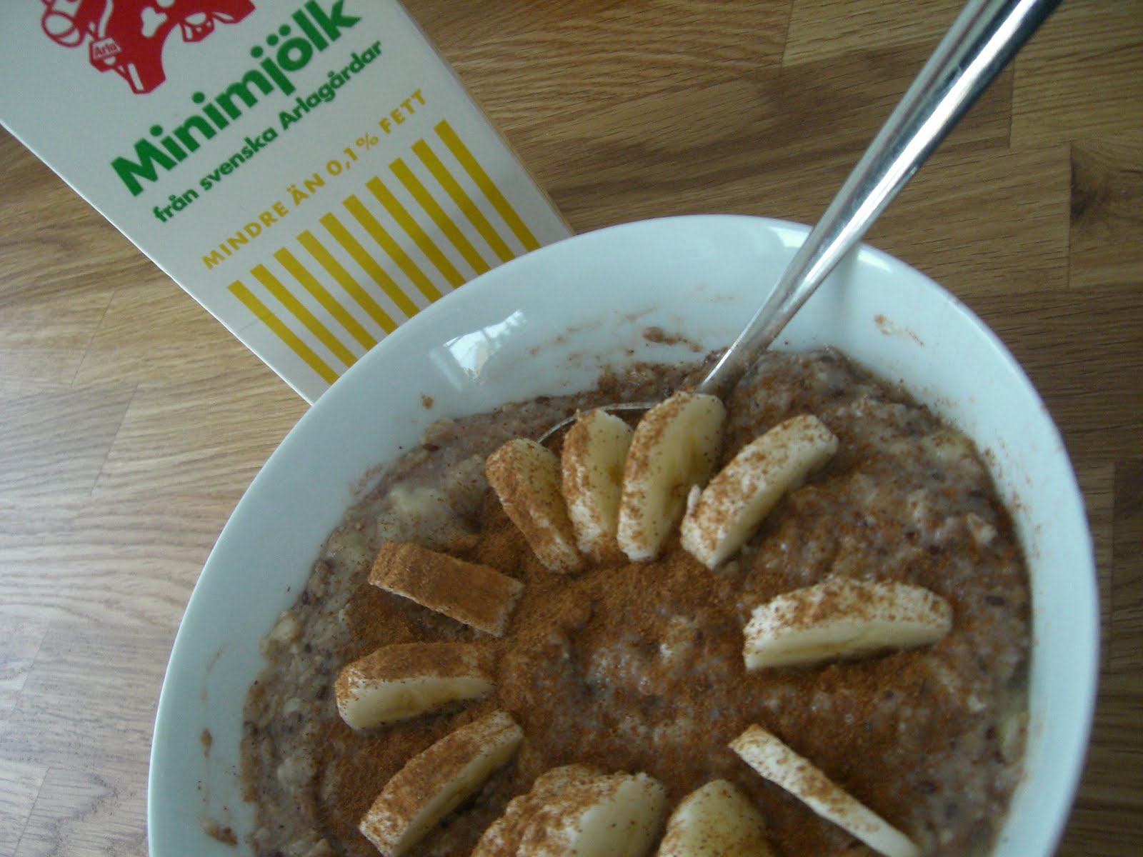 Min favoritgröt består av fiberhavregryn, psylliumfrön, solrosfrön, proteinpulver, kanel, banan och mjölk. Mums!