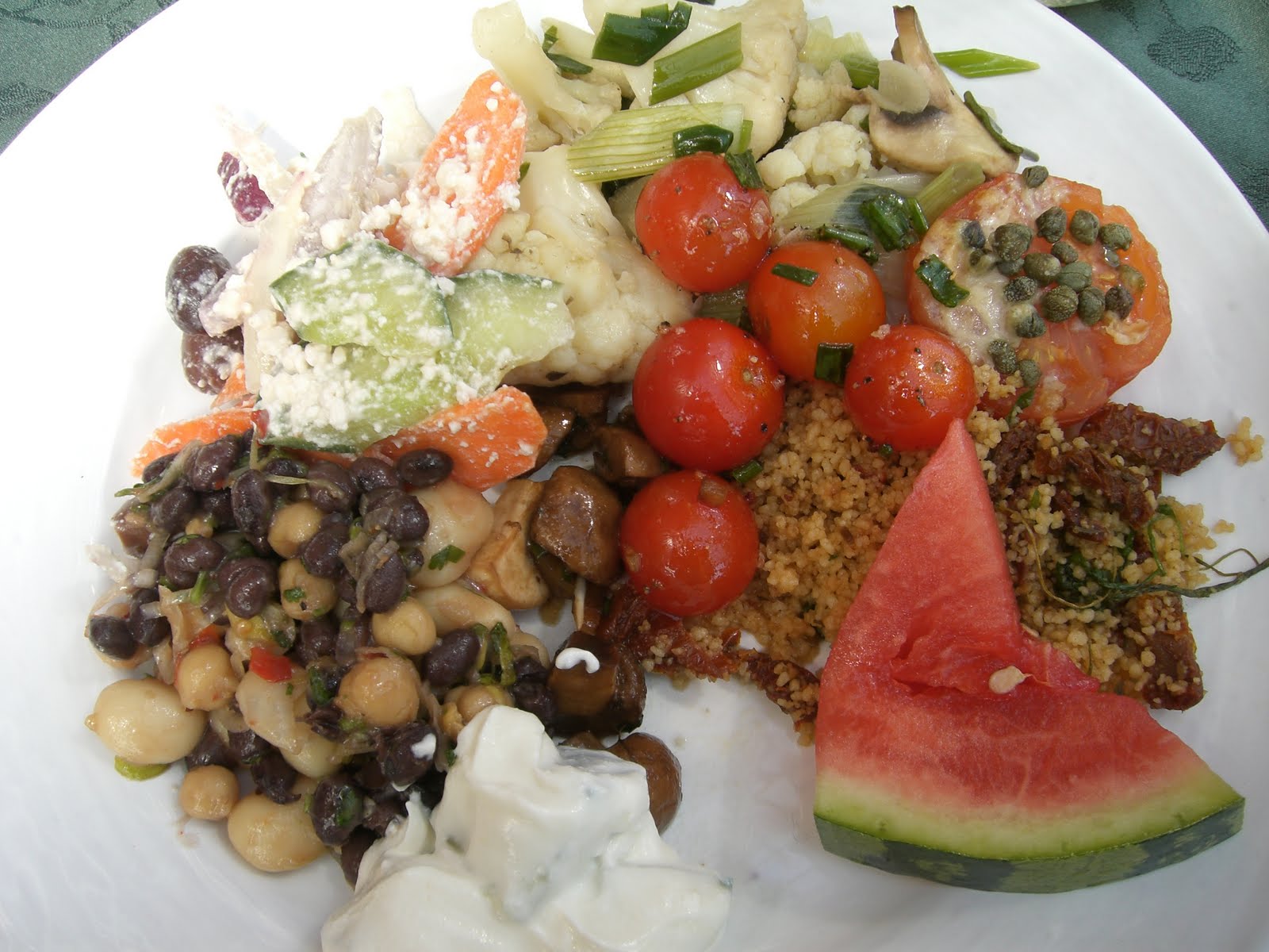 Vi valde den vegetariska lunchbuffén och fick njuta av en mängd olika vegetariska rätter. Jag åt bönsallad, couscoussallad med soltorkade tomater, marinerade körsbärstomater, blomkål, grönsaker med fetaost, ugnsgratinerad tomat, tzatziki och vattenmelon. Till förrätt åt jag en mycket god broccolisoppa.