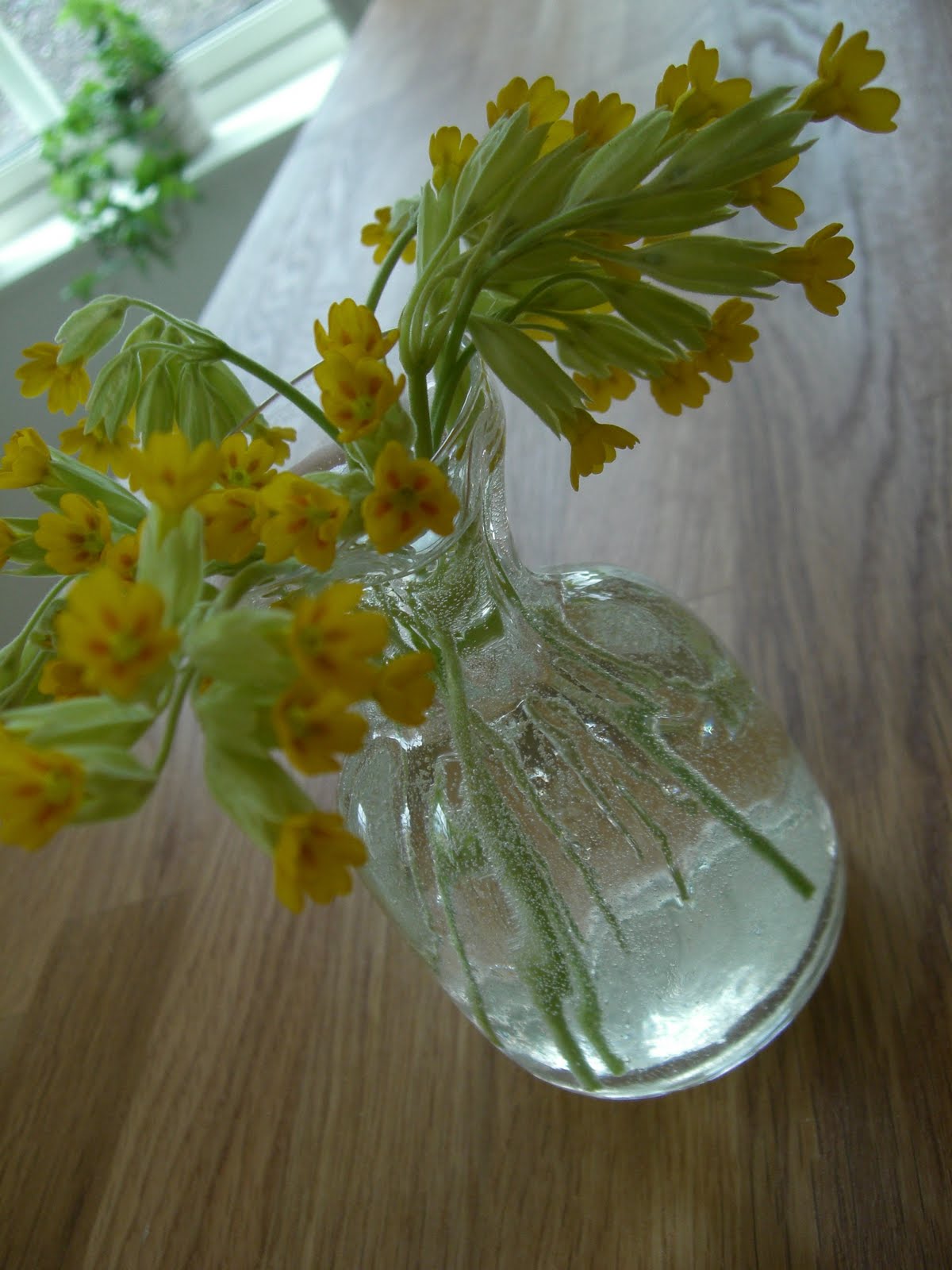 Under vår promenad njöt vi av vackra träd, blomstrande buskar och fina blommor på marken. Jag plockade en liten bukett gullvivor och tog hem. Så nu har vi lite sommar här hemma också!