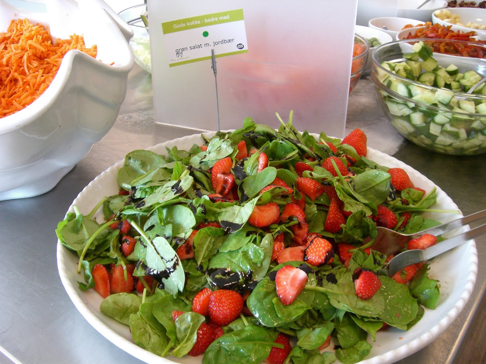 Ovan till höger syns en underbart god sallad som fanns på salladsbuffén igår och som jag tog mycket av: jordgubbar med bladspenat och balsamvinäger. Mums!