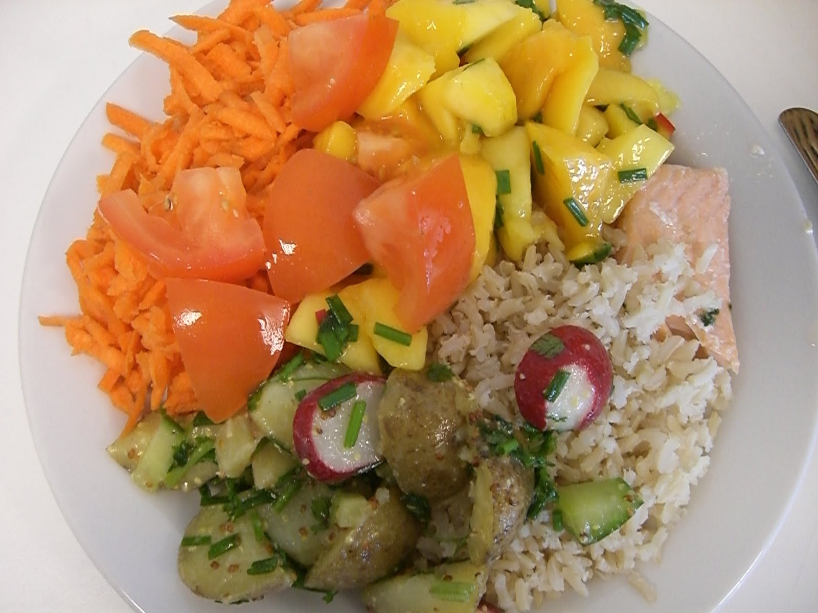 (som ligger gömd under allt det andra) med fullkornsris, lite kall potatissallad, rivna morötter, tomater och mango med chilismak. Mycket gott! Speciellt kombinationen lax och mango gillade jag.