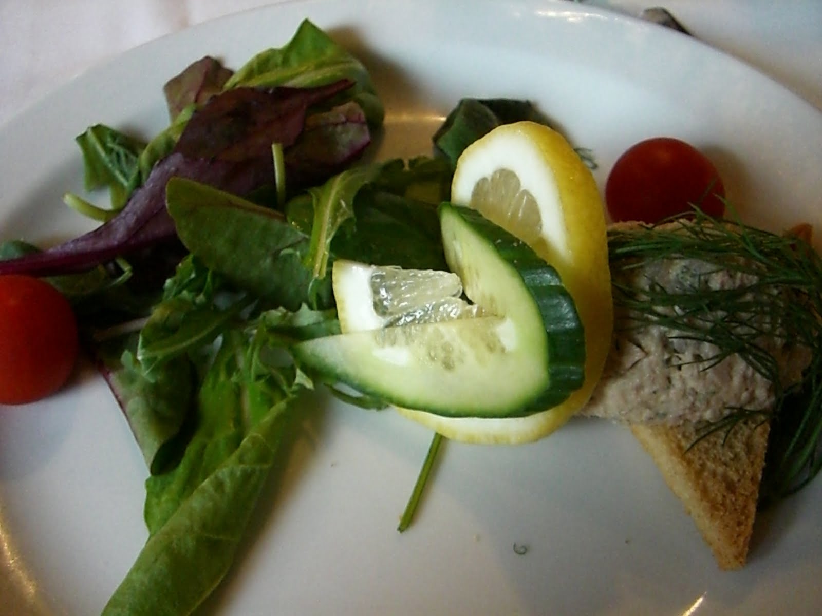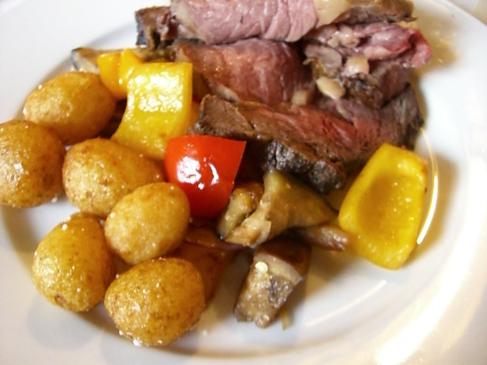 Tvårättersmiddagarna på hotellet består alltid av en förrätt och en huvudrätt. Ikväll fick vi en tonfiskmousse med sallad och tillbehör till förrätt och oxfilé med potatis och ugnsrostade grönsaker till varmrätt. Som ni ser var varmrätten en rejäl portion. Jag orkade knappt äta upp hälften… Men det var nog lika bra det eftersom en stor del av köttet av ganska rött, vilket jag som gravid inte bör äta så mycket av. Jag höll mig till de välstekta delarna av köttet istället.