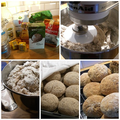 Efter jobbet idag ställde jag mig och bakade bröd. Jag var sugen på goda frallor och eftersom de jag bakade för ett tag sedan var slut så bestämde jag mig för att baka nya. Jag utgick från detta recept, men modifierade det lite efter vad vi hade hemma. Resultatet verkar mycket gott. Har inte smakat dem än.