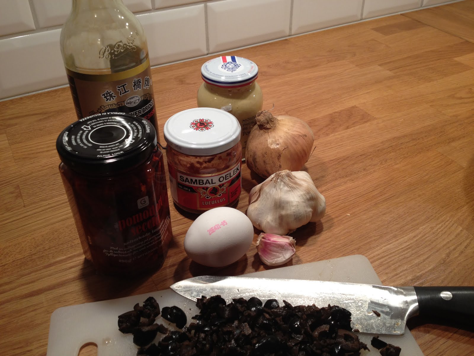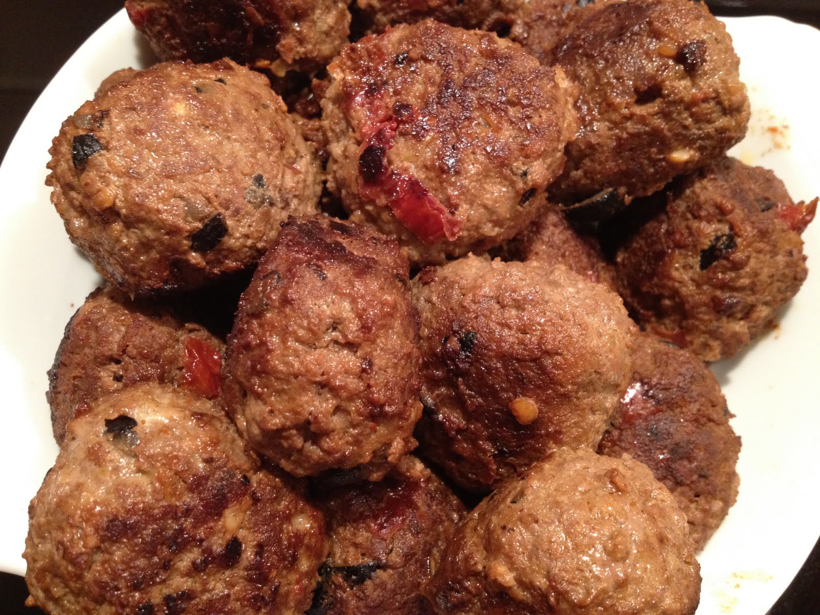 Idag har jag lagat en stor sats med köttbullar att äta till dagens middag och luncher framöver. Jag gillar att blanda i en mängd smakrika saker i min köttbullssmet. Ofta har jag i kapris, oliver och soya för sälta och senap, vitlök och chili för hetta. Idag blandade jag i det vi hade hemma. Här kommer dagens köttbullsrecept.