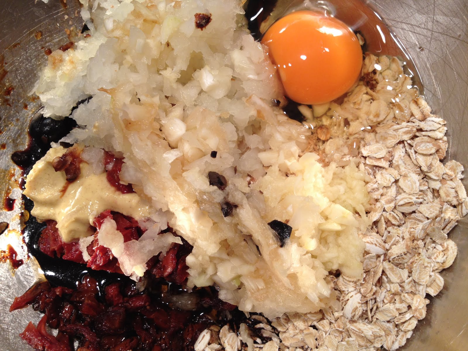 Riv den gula löken och vitlöken. Blanda alla ingredienserna förutom köttfärsen. Jag tycker att det är bättre att blanda allt utom köttfärsen först då det blir bättre ihop blandat då. Tillsätt köttfärsen och blanda tills allt är en enda smet.