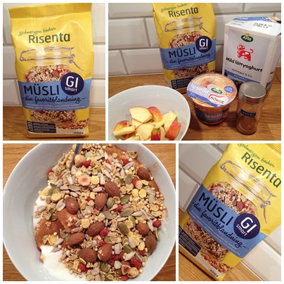 Det är måndag morgon och jag sitter och njuter av en god frukost. I tallriken har jag kesella, mild naturell yoghurt, äpple, kanel och Risentas nya GI smart müsli.