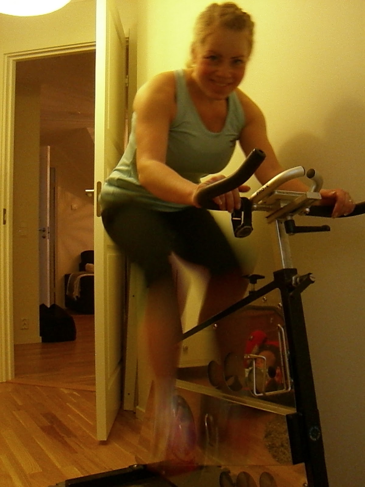 Jag inledde träningen med tio minuter på spinningcykeln. Det var skönt att trampa på, få upp flåset lite och bli varm i kroppen. När jag klev på cykeln märkte jag att styret satt nästan komiskt högt upp. Senast jag tränade på den var jag nämligen gravid och hade en stor mage i vägen. Mot slutet av graviditeten kunde jag bara träna på sittcykel, där man sitter i jämnhöjd med styret. Nu var det skönt att åter kunna dra ned styret och kunna sitta mer framåtlutad på sadeln.