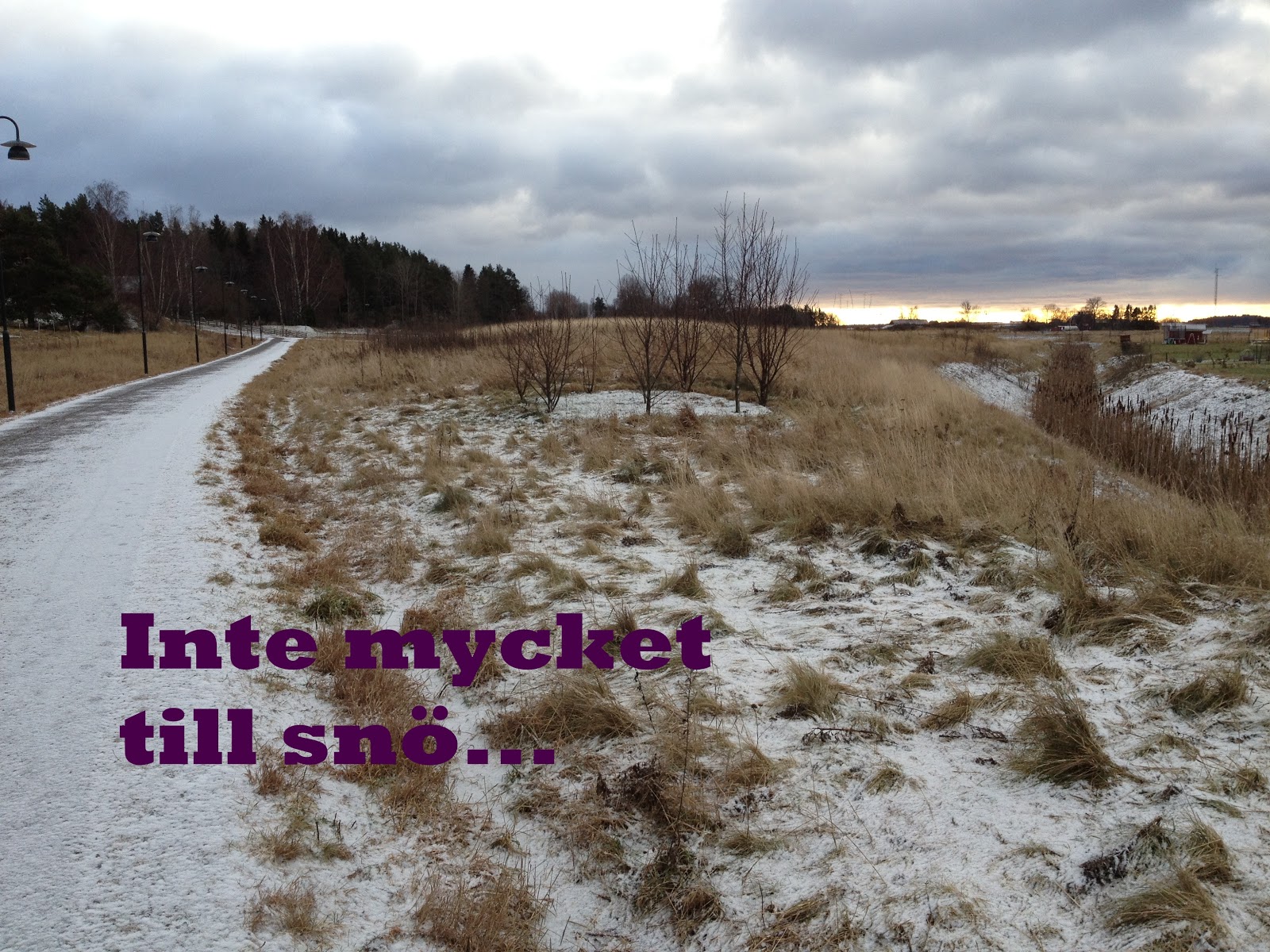 Det slutade att yra snö efter ungefär halva promenaden. Men trots snöyran hade det knappt fastnat någon snö på marken alls. Synd. För det är ju mycket vackrare med ett snöbeklätt landskap.