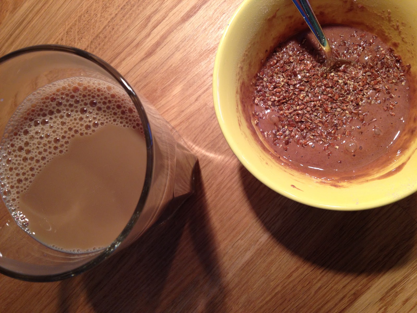 Jag ska köra lite gummibandsträning här hemma på morgonen och vill inte äta alltför stor frukost innan. Istället för att blanda till en proteinshake, som jag vanligtvis gör innan morgonträning, valde jag att testa proteinkräm istället i morse. Anna brukar göra det och jag har undrat hur det smakar så därför ville jag testa detta. Det man gör då är att man tar samma mängd proteinpulver som när man gör en proteinshake, men mycket mindre vätska. Man blandar i lite vatten eller mjölk i pulvret så att konsistensen blir en kräm istället för en vätska. Jag strödde även över krossade linfrön över min proteinkräm.