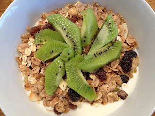 Frukosten var en ordinär sådan även igår: naturell yoghurt med frukt (dock ej med kiwi utan med banan och äpple) och Fruity & Nutty Müsli.