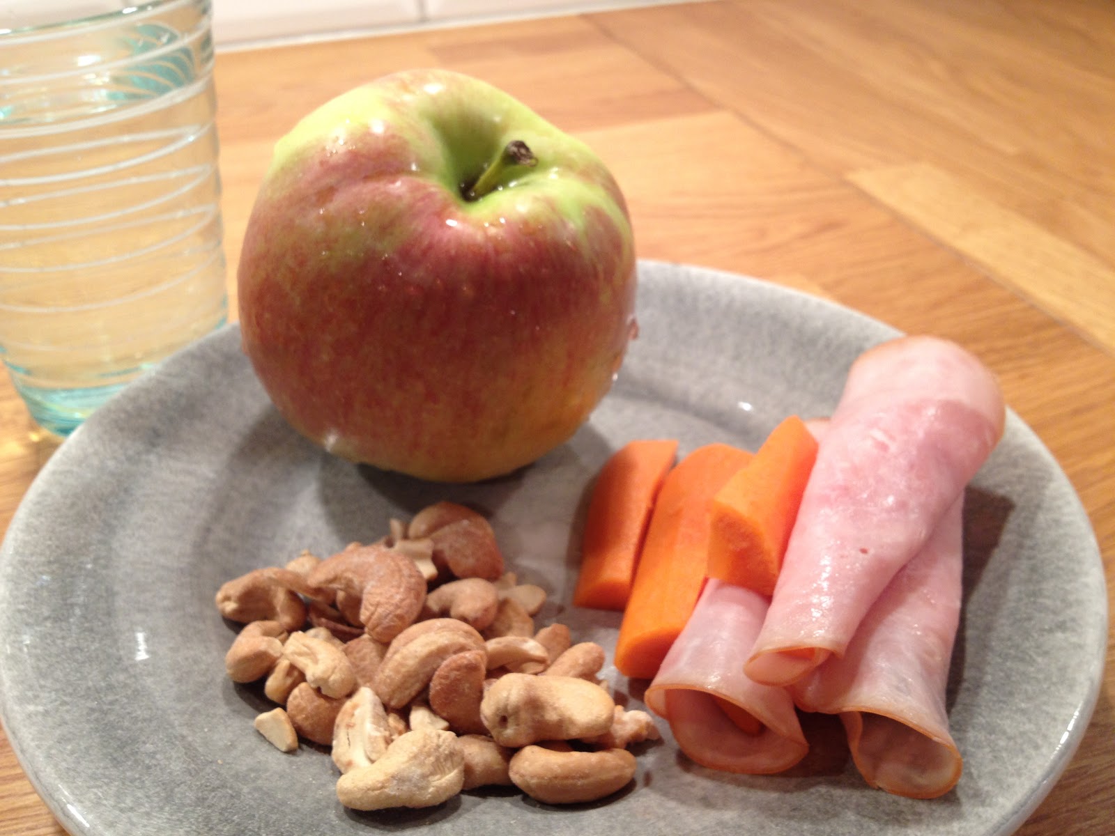 När jag kom hem på sena eftermiddagen var jag mycket hungrig och åt ett mellanmål så snabbt som möjligt. Det blev morotsstavar, några skivor rökt skinka, cashewnötter och ett äpple. Gott och mättande!