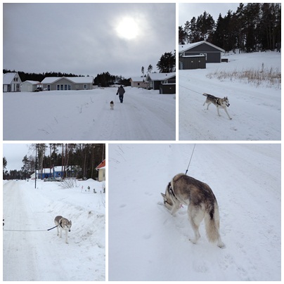Det har blivit några promenader med hund i helgen då vi har varit hundvakt. Igår var det skönt vinterväder att promenera i; några minusgrader och plogat på vägarna. Idag var det inte lika roligt; slaskigt eftersom det var några plusgrader och kalla vindar. Men har man hund så måste man ju ge sig ut oavsett väder.