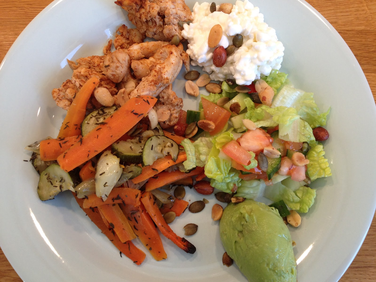 Efter tvättbestyr och matlagning när jag kom hem sitter jag nu och äter en god lunch bestående av kyckling, ugnsrostade grönsaker, keso, avokado, sallad och nötter. Till det ett par skivor knäckebröd. När jag var ute och promenerade var det mulet. Nu skiner såklart solen. Vore inte helt fel att ge sig ut på en till promenad alternativt sitta i solväggen och njuta, men å andra sidan har jag en del att pyssla med här inne. Vi får se hur det blir.