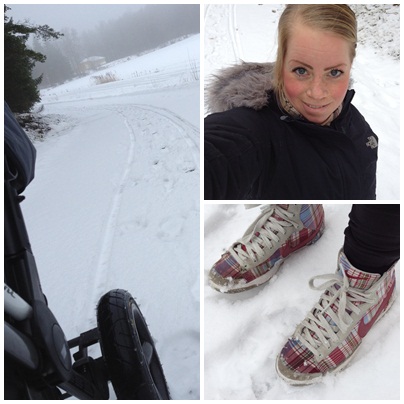 Mitt val av sko var inte så smart märkte jag ganska direkt då flera av vägarna jag gick på inte hade blivit plogade ännu. Under första halvan av promenaden gick jag alltså i nysnö med en lurigt hal isgata under. Jag kunde inte gå lika snabbt som jag hade velat och blev såklart blöt om fötterna. Men eftersom jag väljer att tänka positivt var snön bra på så vis att jag fick mer träning av att dra vagnen i snön.