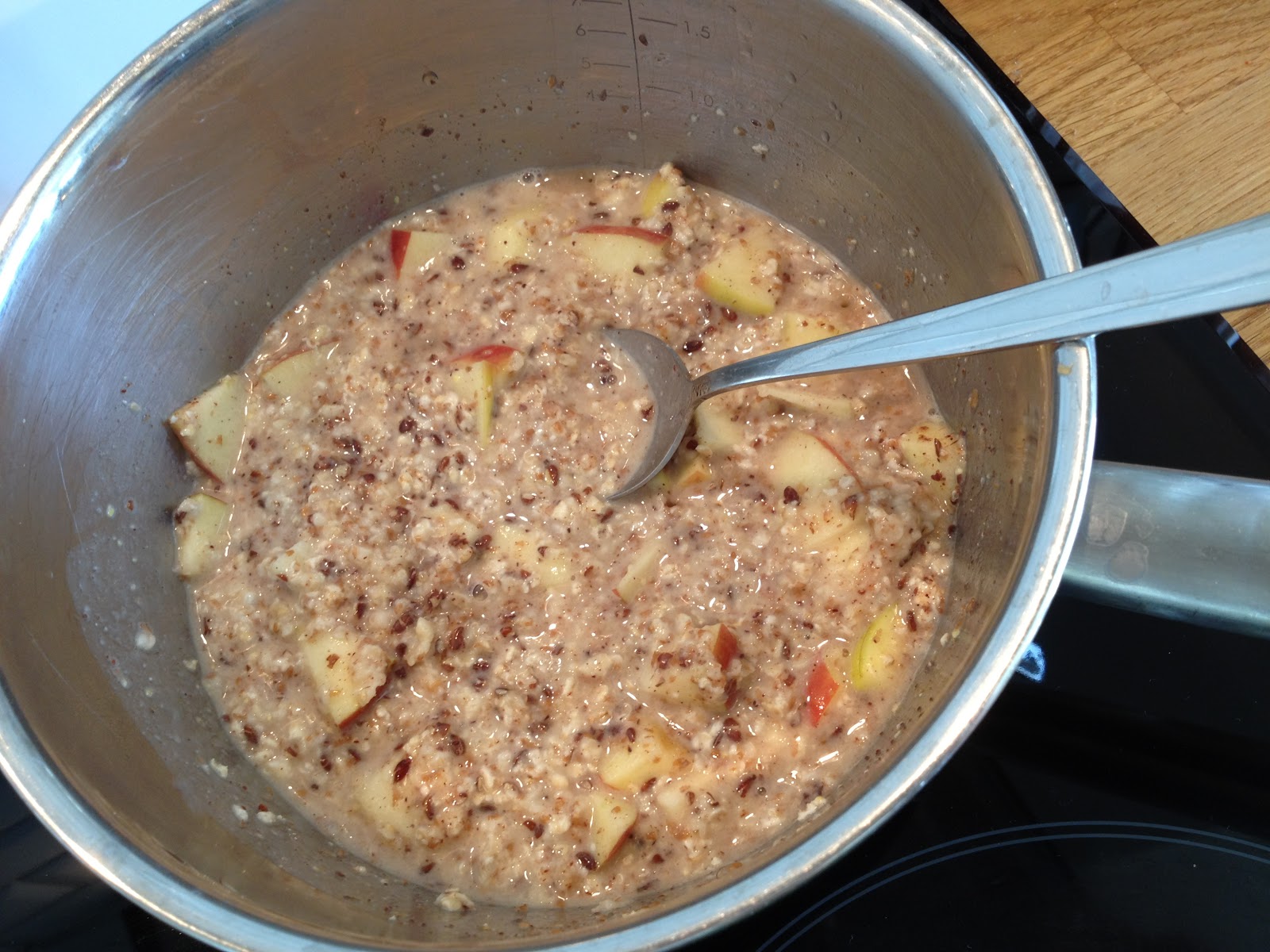 Det blir faktiskt mycket godare när man kokar gröt i kastrull än när man tillagar den i micron. Så jag gjorde som Anna tipsade om och kokade fiberhavregryn, små äppelbitar (hade inte päron hemma), krossade linfrön, kanel och vatten på spisen. När gröten hade puttrat klart efter några minuter lade jag upp den i en skål och toppade med resten av äpplet, mer kanel och en massa kokos. Med kall mjölk smakade detta mycket gott! Tack för tipset Anna!