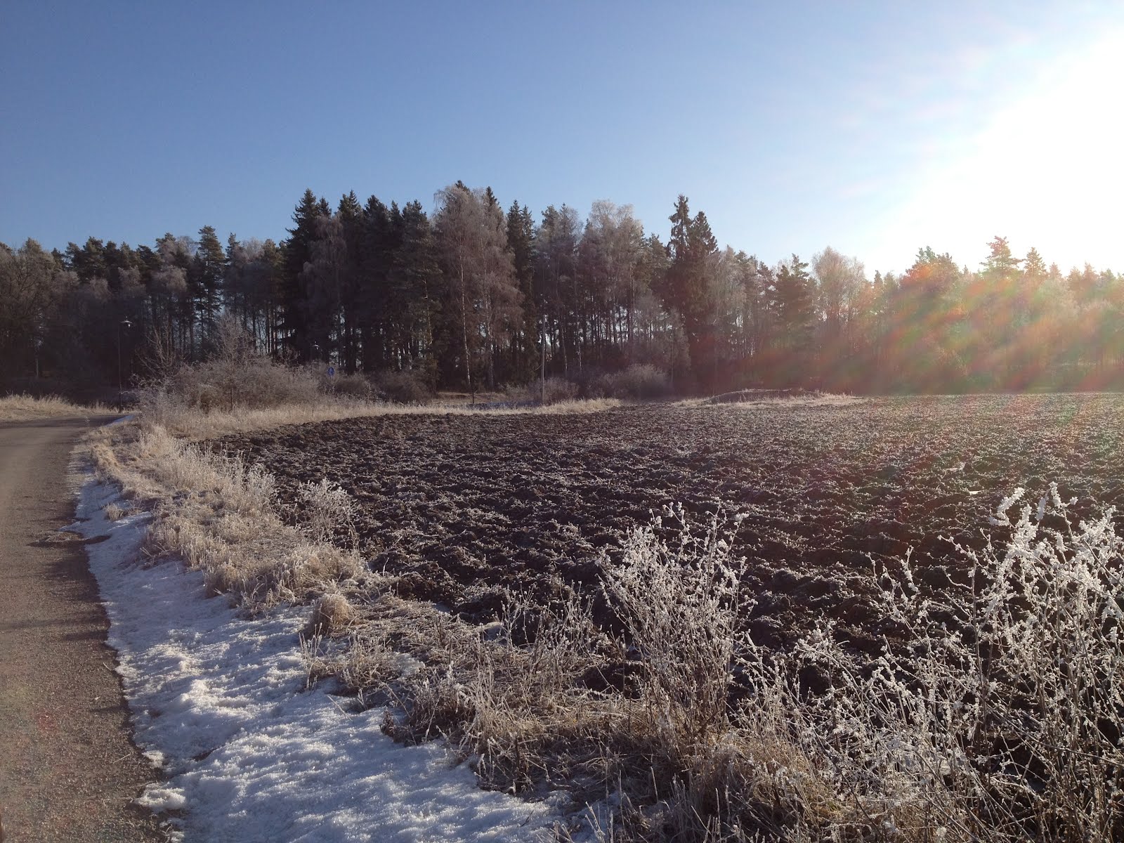 Idag har vi åter en dag med helt underbart väder. Solen skiner och himlen är klarblå. I morse när jag gick till massagen var det krispigt vitt ute efter nattens frost. Men nu har det försvunnit efter att solen har skinit hela dagen. Eftersom det var så skönt att vara ute gick jag en lite längre runda än jag hade planerat. Balsam för både kropp och själ med ett sådant härligt promenadväder!