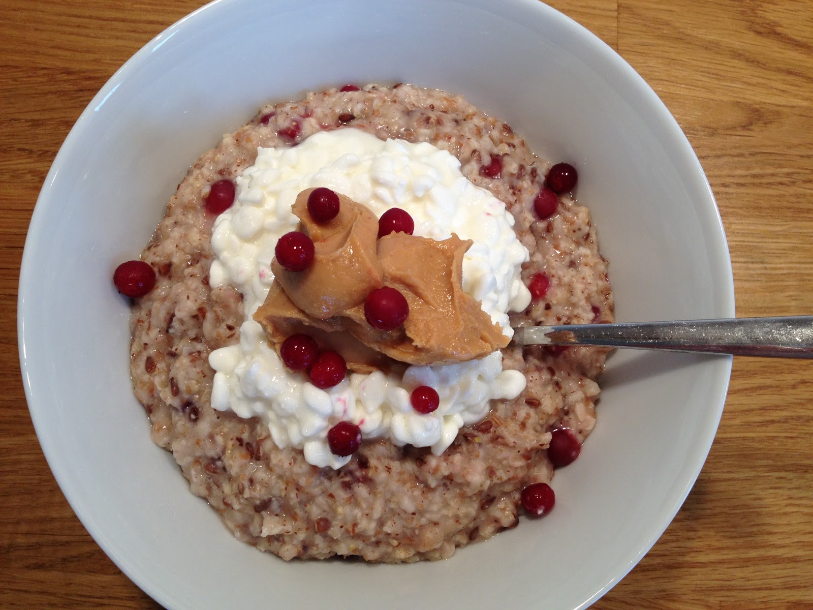 Efter träningen smakade frukost nummer 2 lingongröt mycket gott! Det var första gången som jag testade att koka havregrynsgröten tillsammans med lingon. Hade även i kanel och krossade linfrön. Åt sedan gröten tillsammans med keso och jordnötssmör. En god smakkombination, som jag verkligen kan rekommendera.