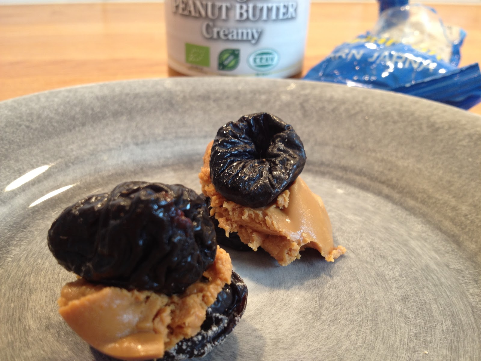 Jag tog några torkade katrinplommon och smörade jordnötssmör mellan två av dem, tryckte ihop och åt. Hur gott som helst! Och bra med nyttig energi.