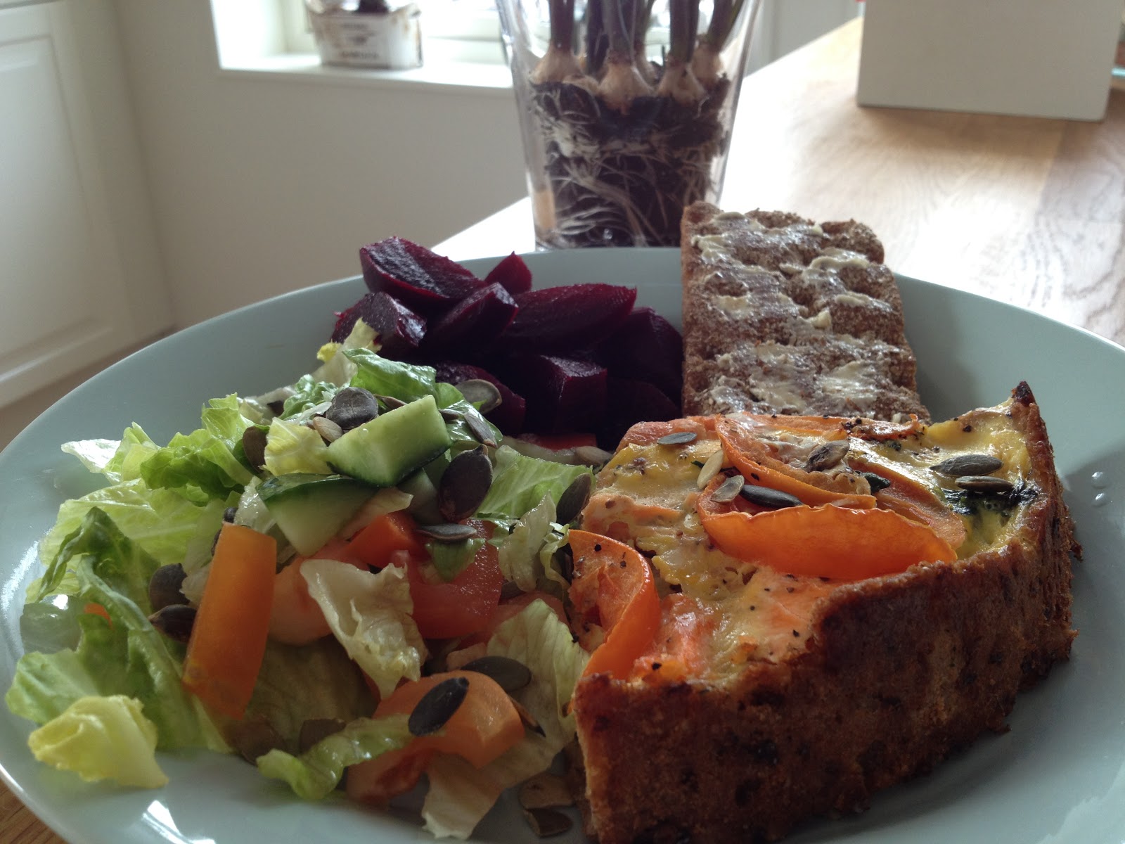 Lax- och spenatpaj gjord på fullkornspajdeg med grönsaker, rödbetor, pumpafrön och två skivor knäckebröd. Se receptet på denna laxpaj här. Mycket god, kan jag lova!