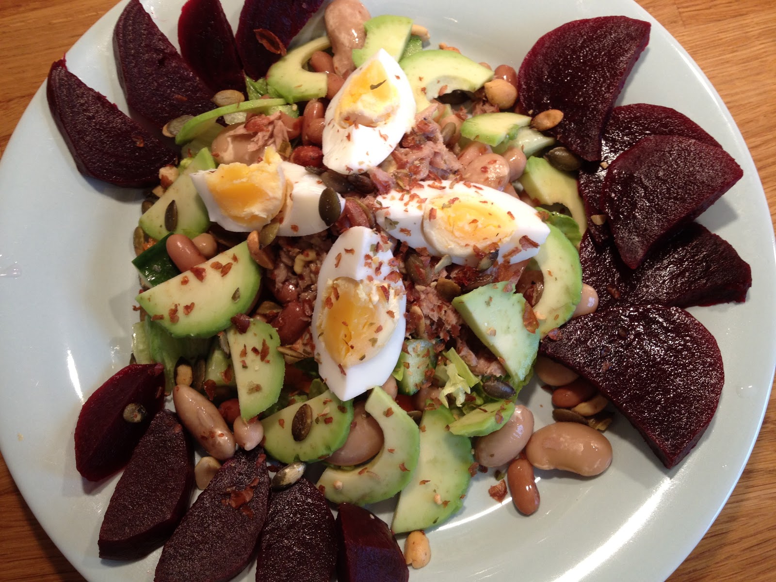 Tonfisksallad gjord på ½ burk tonfisk, bönor och kikärtor från GoGreen’s Bönmix, isbergssallad, gurka, tomat. morot, ½ avokado, rödbetor, 1 kokt ägg, senapsvinägrett och salladsnötter. Åt även två skivor grovt knäckebröd med Bregott till detta.