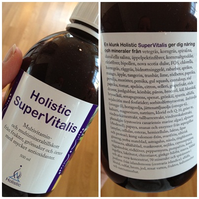 Min kur med mycket frukt de senaste dagarna har visst inte hjälpt helt. Jag vaknade i morse med en rosslig hals, men som tur är har jag fortfarande inte ont i den. Hemma har vi en flaska med Holistic SuperVitalis. Jag brukar normalt sett inte dricka av den eftersom jag får i mig så mycket vitaminer, mineraler och antioxidanter från den kost jag äter. Men nu när jag inte tänker riskera att bli förkyld tar jag mig en hutt av denna.
