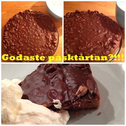 Inspirerad av Karro bakade jag en jordnötskladdkaka häromdagen och smakade av den igår. Mums, godare påsktårta än den får man leta efter! Kladdkakor går ju snabbt att baka och det gjorde även denna. Det som skiljer denna åt den traditionella kladdkakan är att den även har ett överdrag av smält choklad och jordnötter. Med vispad grädde till blev detta hur gott som helst.
