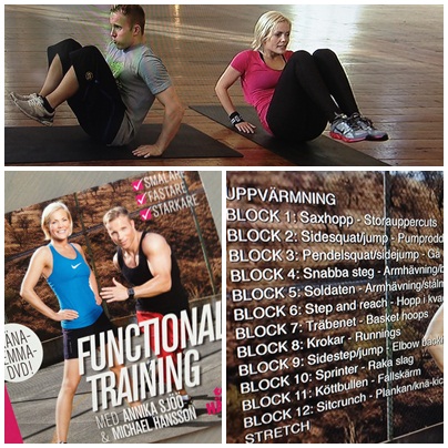 Min träning idag var ett pass funktionell träning då jag testade dvd’n Functional Training med Annika Sjöö och Michael Hansson. Jag gillar att träna funktionellt och jag har läst om när Annika Sjöö själv berättar om hur bra form hon har kommit i efter att ha börjat träna på det här sättet. Så jag hade ganska höga förväntningar på dvd’n.