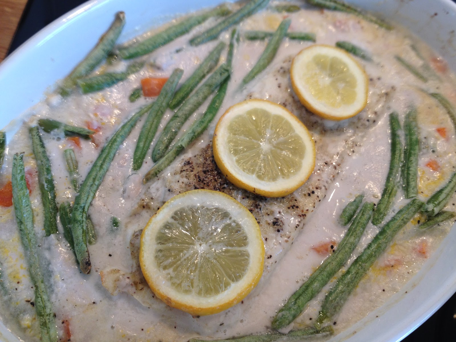 Börja med att lägga den frysta fiskbiten i en ugnsfast form. Skala morötterna och skär i slantar. Lägg dessa och haricot verts runt fisken. Krydda fisken och skvätta på lite citronsaft. Lägg gärna citronskivor på fisken också. Häll på kokosmjölken. In i ugnen i 225 graders värme i ca 25 minuter.